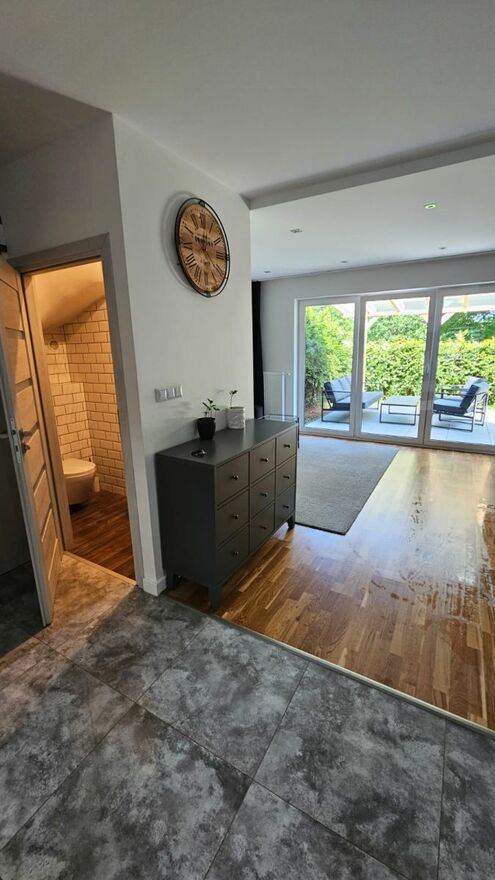 -przestronny salon z jadalnią i wyjściem na duży taras oraz ogród,