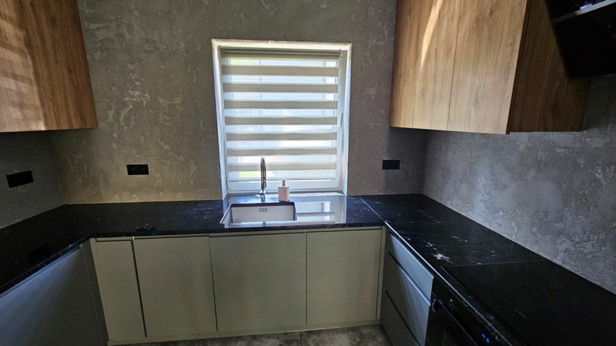 Na podłodze deska barlinecka, wysokiej jakości zabudowa kuchni wraz ze sprzętem AGD.