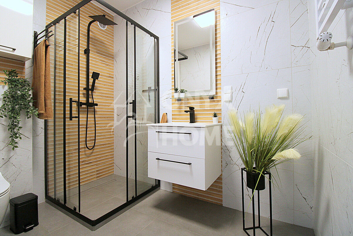 Łazienka- wyposażona w nowoczesny prysznic oraz starannie dobraną armaturę, a jej wykończenie nawiązuje do stylistyki całego mieszkania, tworząc spójną, elegancką przestrzeń.