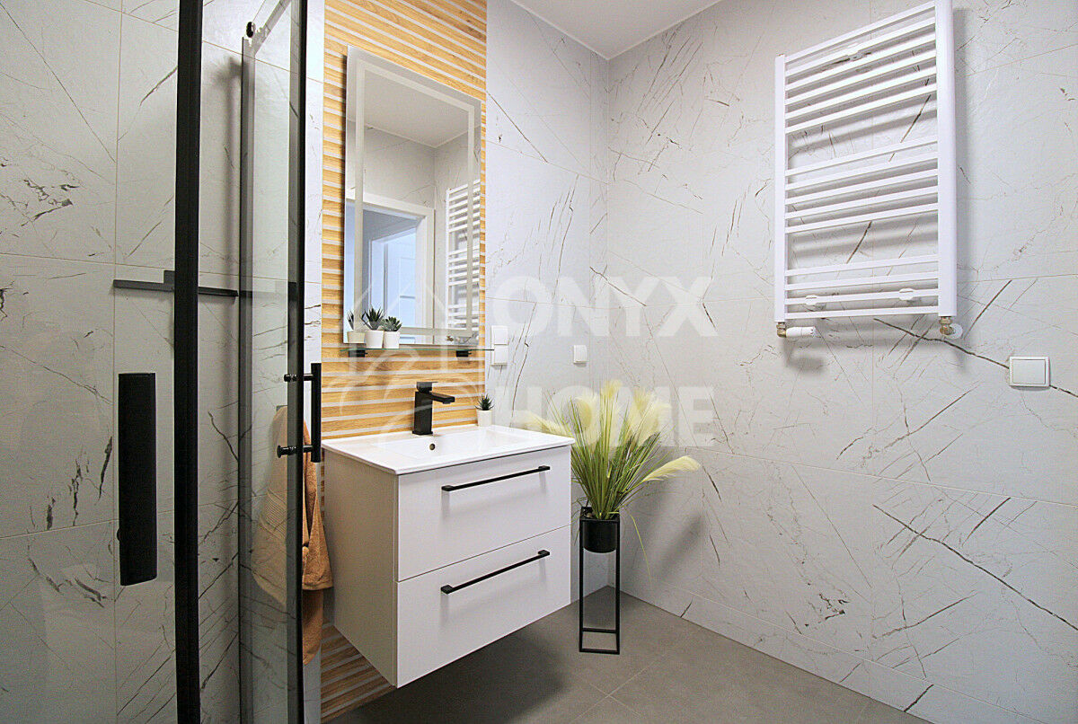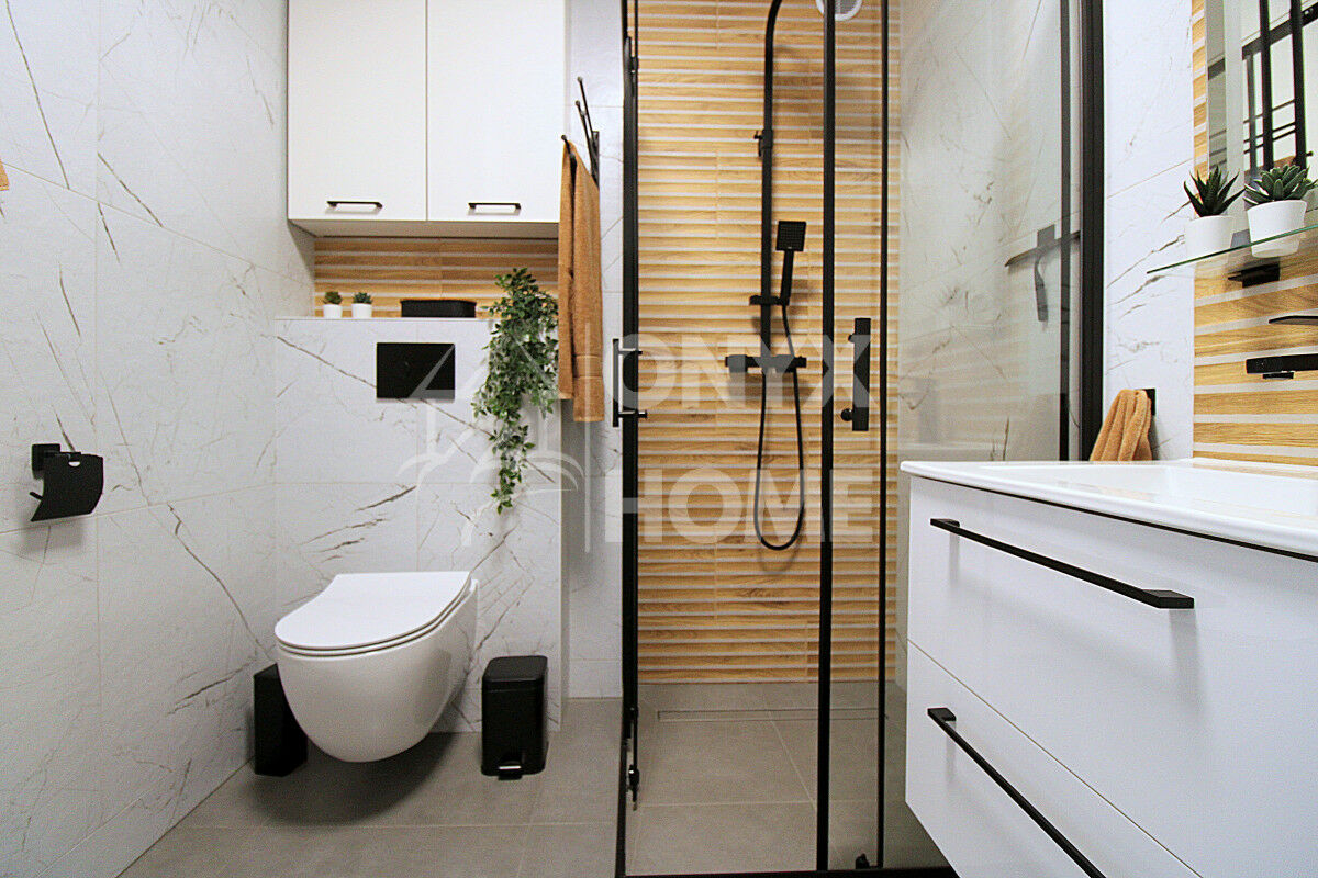 Wnętrze zaprojektowano w nowoczesnym, eleganckim stylu, bazując na ponadczasowej kolorystyce: bieli, beżu oraz czerni. Harmonijne połączenie tych barw sprawia, że przestrzeń jest jasna, przytulna i niezwykle estetyczna. Całość dopełniają modne lamele ścienne, które nadają wnętrzu charakteru i podkreślają jego designerski styl.